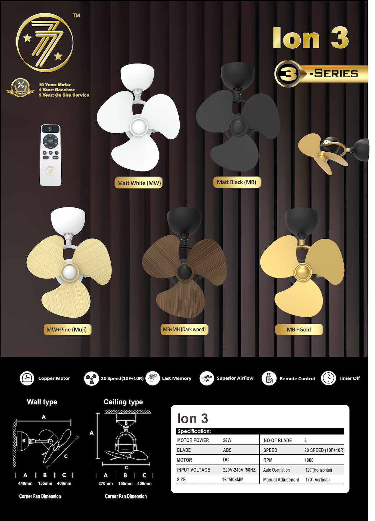 The Ion 3 DC Fan blends modern style with efficient performance. Featuring 3 blades and a 16-inch span, it offers 20 speeds (10 forward + 10 reverse) for customizable airflow. Control easily with the included LED remote — ideal for any contemporary space.