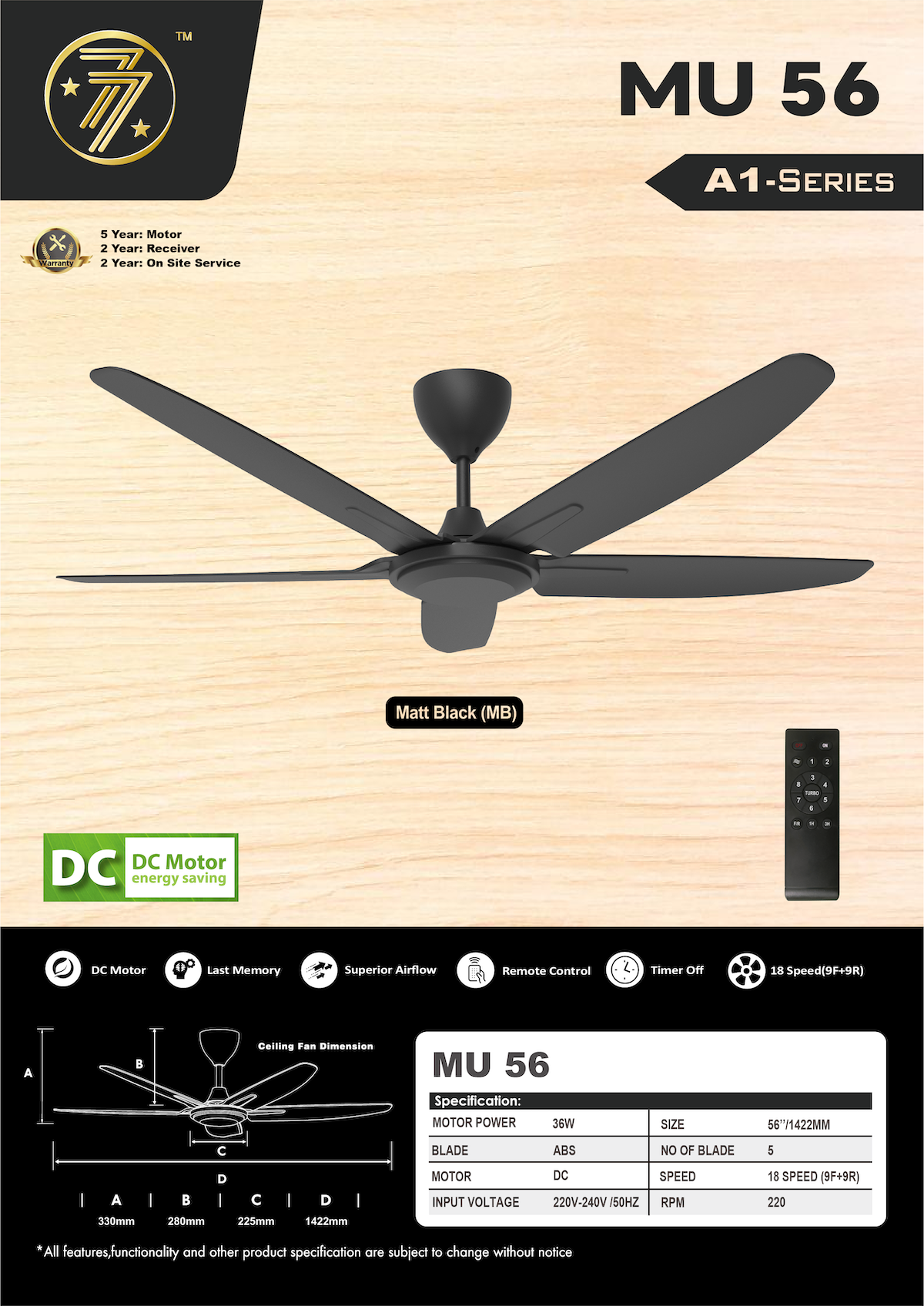 The MU 56 DC Fan combines modern style with exceptional performance. Featuring 5 blades and a 56-inch span, it delivers 18 speeds (9 forward + 9 reverse) for precise airflow control. Operated via remote, the MU 56 ensures smooth, quiet, and energy-efficient comfort in any setting.