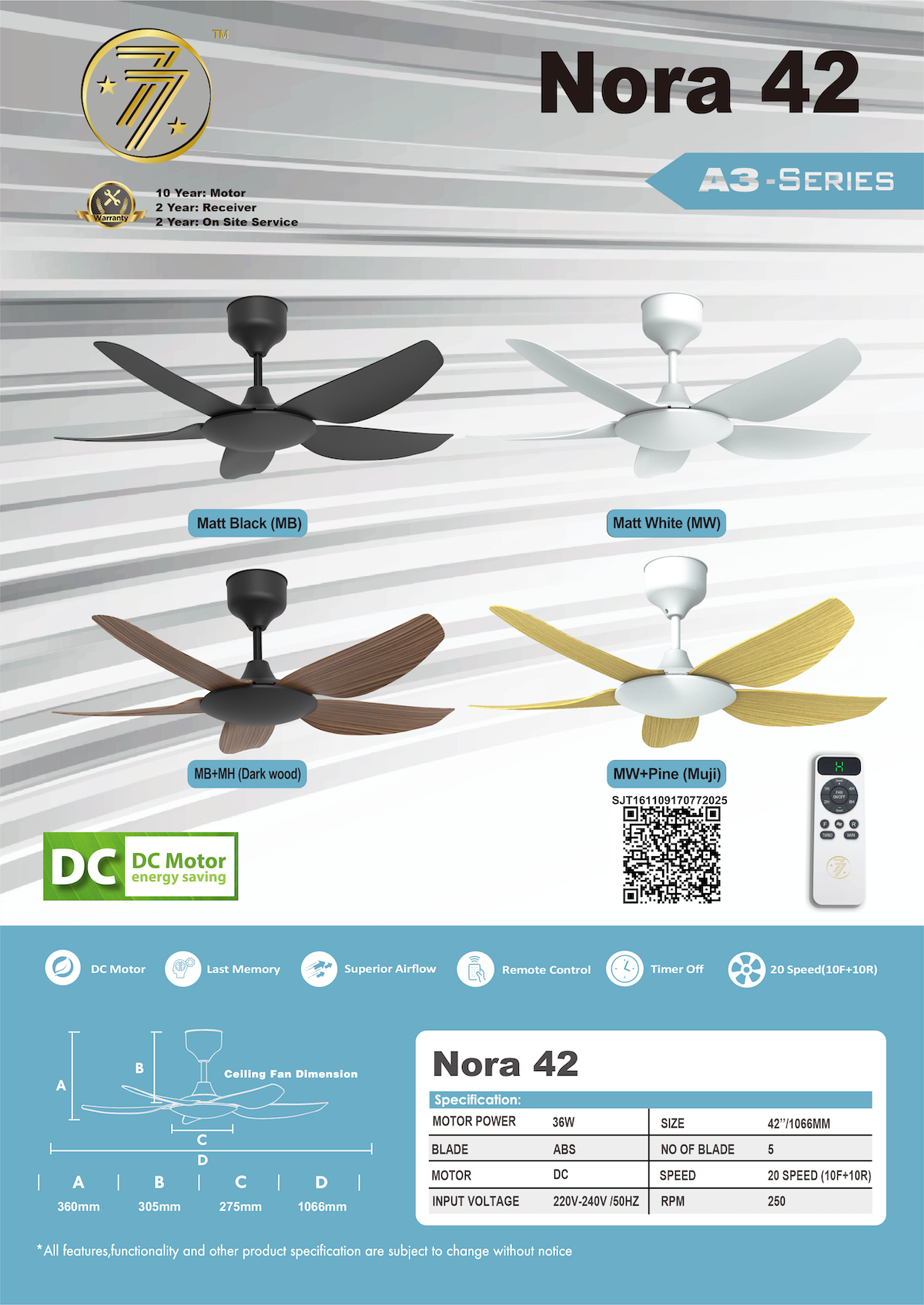 The Nora 42 DC Fan brings modern design and efficient comfort to compact spaces. Featuring 5 blades and a 42-inch span, it offers 20 speeds (10 forward + 10 reverse) for ideal airflow control. Operated via LED remote, the Nora 42 ensures smooth, quiet, and energy-saving performance.