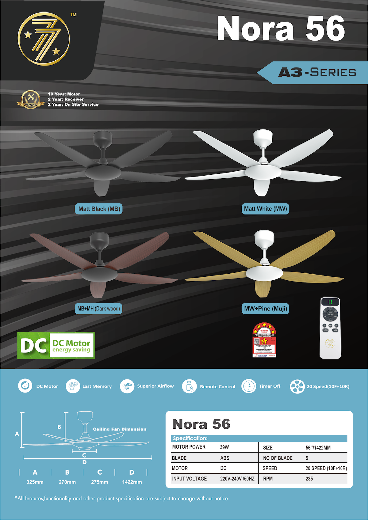 The Nora 56 DC Fan offers a perfect balance of elegance and performance. With 5 blades and a 56-inch span, it delivers 20 speeds (10 forward + 10 reverse) for personalized airflow. Controlled effortlessly via LED remote, the Nora 56 ensures quiet, energy-efficient comfort for any modern space.
