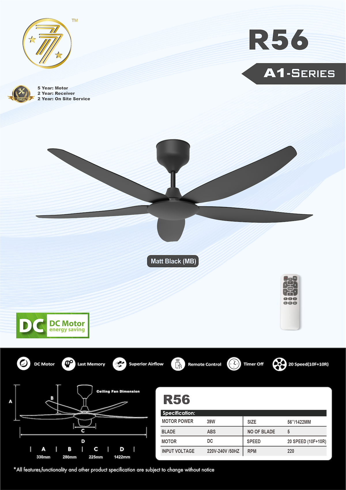 The R56 DC Fan combines elegant design with superior airflow efficiency. Equipped with 5 blades and a 56-inch span, it offers 20 speeds (10 forward + 10 reverse) for customized comfort. Easily managed with a remote control, the R56 delivers quiet, powerful, and energy-saving performance.