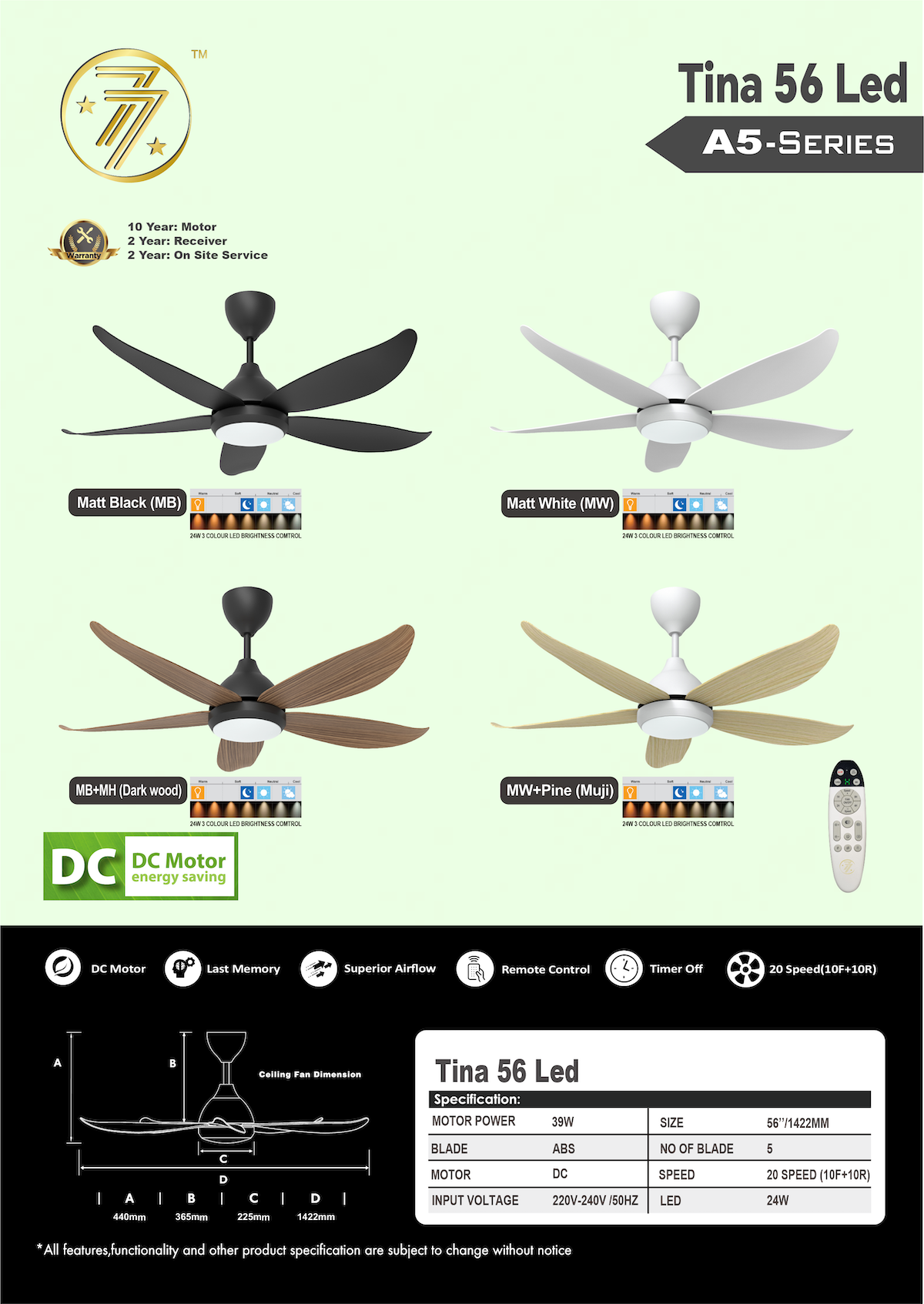 The Tina 56 LED DC Fan combines powerful airflow with versatile illumination. Featuring 5 blades and a 56-inch span, it offers 20 speeds (10 forward + 10 reverse) for precise control. Equipped with a 24W 3-color LED light with brightness control and remote, the Tina 56 LED delivers comfort, efficiency, and style in one sleek design.