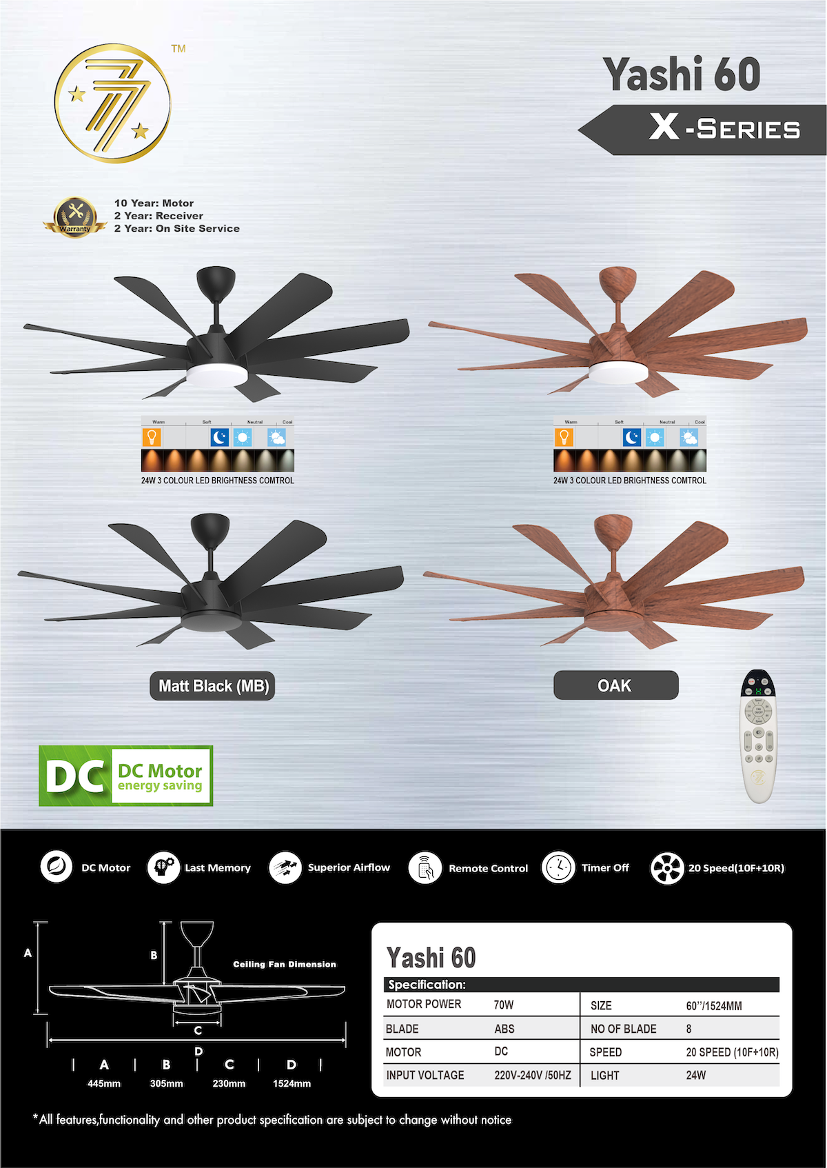 The Yashi 60 LED DC Fan combines powerful airflow with versatile illumination. Featuring 8 blades and a 60-inch span, it offers 20 speeds (10 forward + 10 reverse) for precise control. Equipped with a 24W 3-color LED light with brightness control and remote, the Yashi 60 LED delivers comfort, efficiency, and style in one sleek design.
